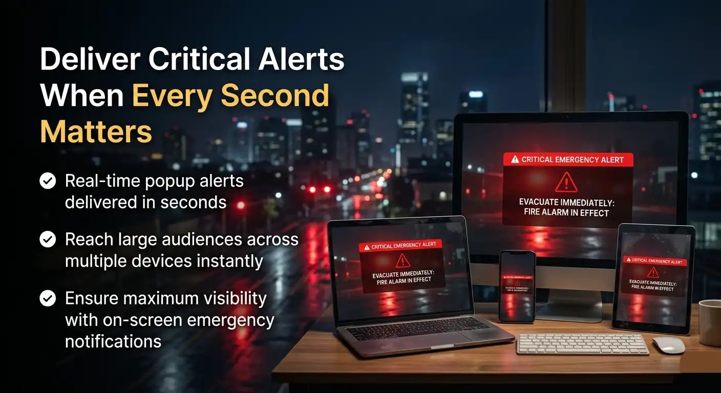 Send critical popup alerts instantly to keep users informed during emergencies or time-sensitive situations. Ensure important messages reach every screen when it matters most.